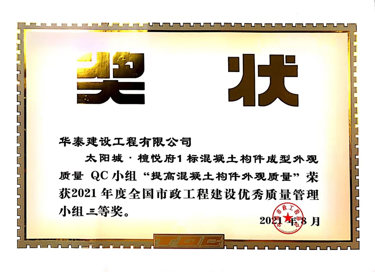 太陽(yáng)城·檀悅府1標(biāo)混凝土構(gòu)件成型外觀質(zhì)量QC小組“提高混凝土構(gòu)件外觀質(zhì)量”榮獲2021年度全國(guó)市政工程建設(shè)優(yōu)秀質(zhì)量管理小組三等獎(jiǎng)。