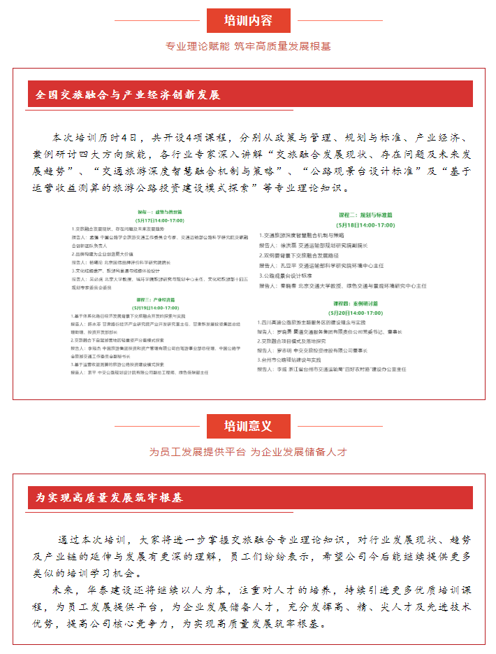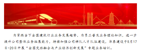 為緊跟當(dāng)下全國(guó)建筑行業(yè)業(yè)務(wù)發(fā)展趨勢(shì),為員工普及業(yè)務(wù)理論知識(shí),進(jìn)一步提升公司整體業(yè)務(wù)拓展能力,持續(xù)加強(qiáng)公司梯隊(duì)人才隊(duì)伍建設(shè),華泰建設(shè)于5月17日-20日開(kāi)展“全國(guó)交旅融合與產(chǎn)業(yè)經(jīng)濟(jì)創(chuàng)新發(fā)展”專(zhuān)題業(yè)務(wù)培訓(xùn)。
