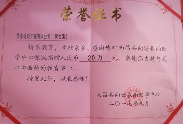 今天我們公司周總代表華泰建設(shè)及公司董事長黃總參加向塘春雨助學(xué)活動(dòng)并捐獻(xiàn)愛心。公司在董事長倡議及帶領(lǐng)下,大力弘揚(yáng)樂善好施的文明行為,積極營造人人關(guān)心、人人參與愛心助學(xué)行為的良好氛圍,先后參與春雨助學(xué)、苗苗助學(xué)等愛心活動(dòng)。