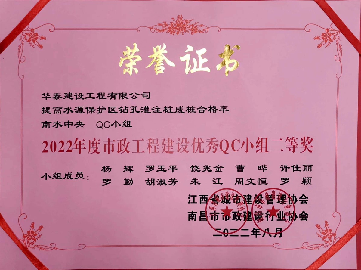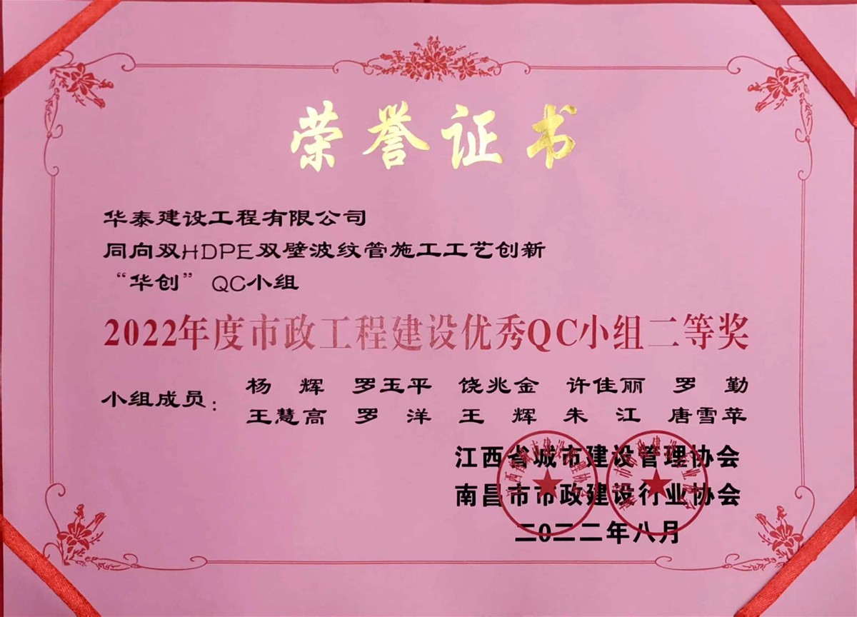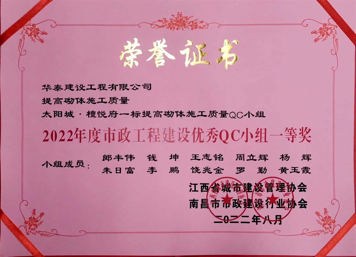 金秋九月,華泰建設(shè)太陽城·檀悅府一標QC小組榮獲2022年度江西省市政工程建設(shè)優(yōu)秀質(zhì)量管理小組活動一等獎,南水中央QC小組及“華創(chuàng)”QC小組榮獲二等獎。
