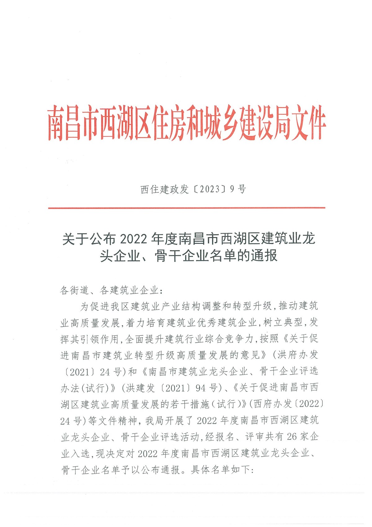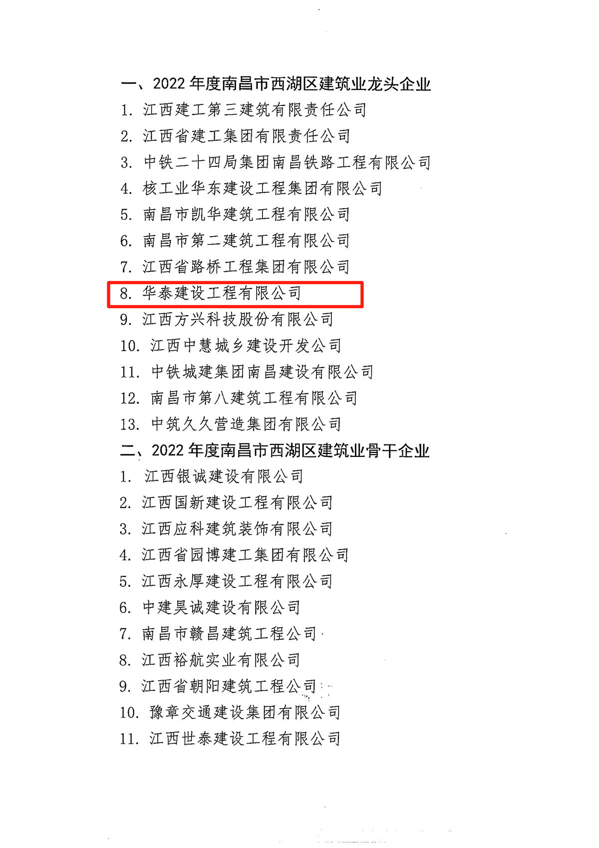 2023年2月21日,恰逢農(nóng)歷二月二龍?zhí)ь^,在這個(gè)紅紅火火的日子,南昌市西湖區(qū)住房和城鄉(xiāng)建設(shè)局發(fā)布了《關(guān)于公布2022年度南昌市西湖區(qū)建筑業(yè)龍頭企業(yè)、骨干企業(yè)名單的通報(bào)》,經(jīng)層層嚴(yán)格考評(píng)認(rèn)定,華泰建設(shè)工程有限公司憑借實(shí)干篤行與卓越品質(zhì)獲得“2022年度南昌市西湖區(qū)建筑業(yè)龍頭企業(yè)”榮譽(yù)稱號(hào)!這是繼2023年1月獲得“2022年度南昌市建筑業(yè)骨干企業(yè)”后的又一個(gè)榮譽(yù)認(rèn)證。這不僅是對(duì)華泰建設(shè)的嘉獎(jiǎng)與再次肯定,更是對(duì)華泰建設(shè)發(fā)展的激勵(lì)與鞭策。