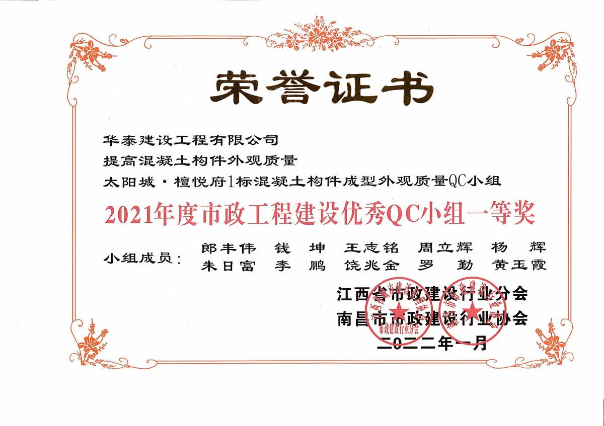 首頁 > 關(guān)于華泰 > 企業(yè)榮譽(yù) > 榮獲2021年度江西省市政工程建設(shè)優(yōu)秀QC小組一等獎(jiǎng)(太陽城·檀悅府)